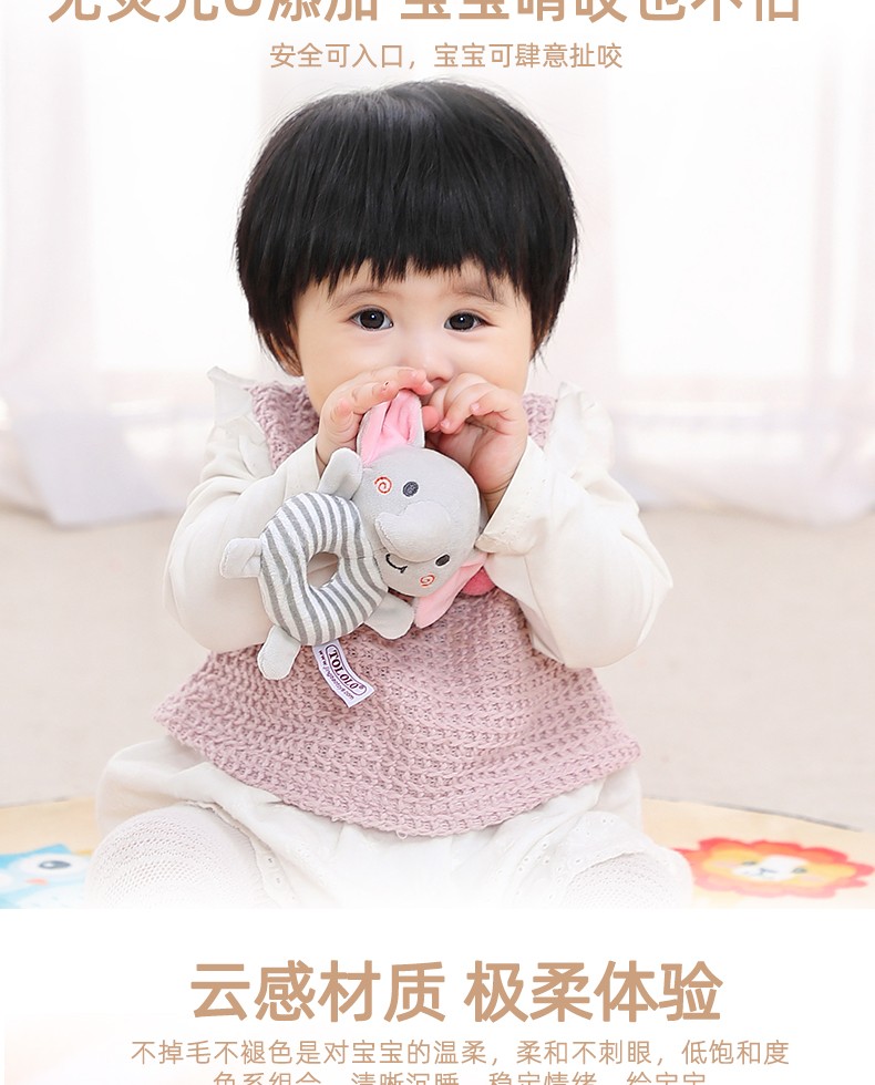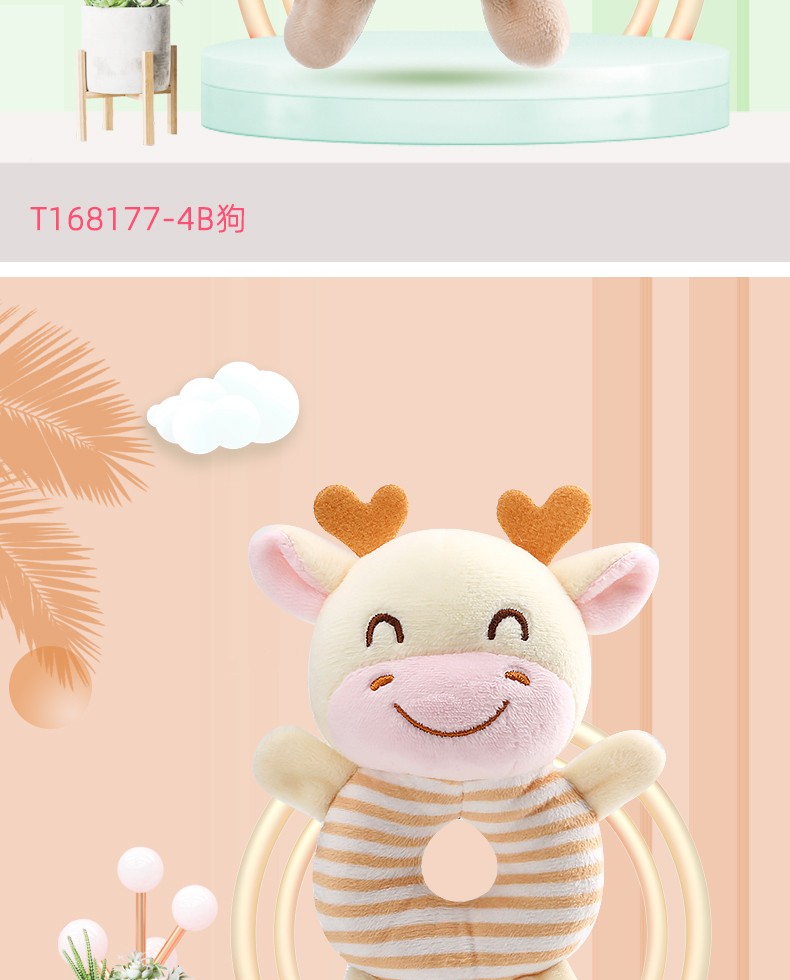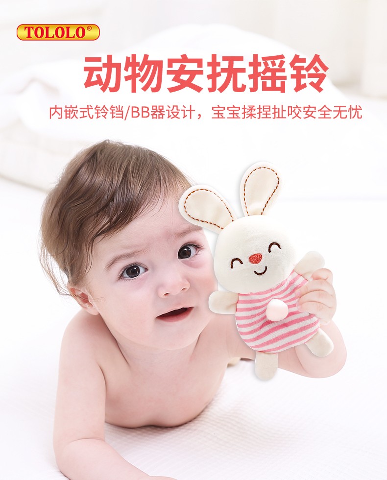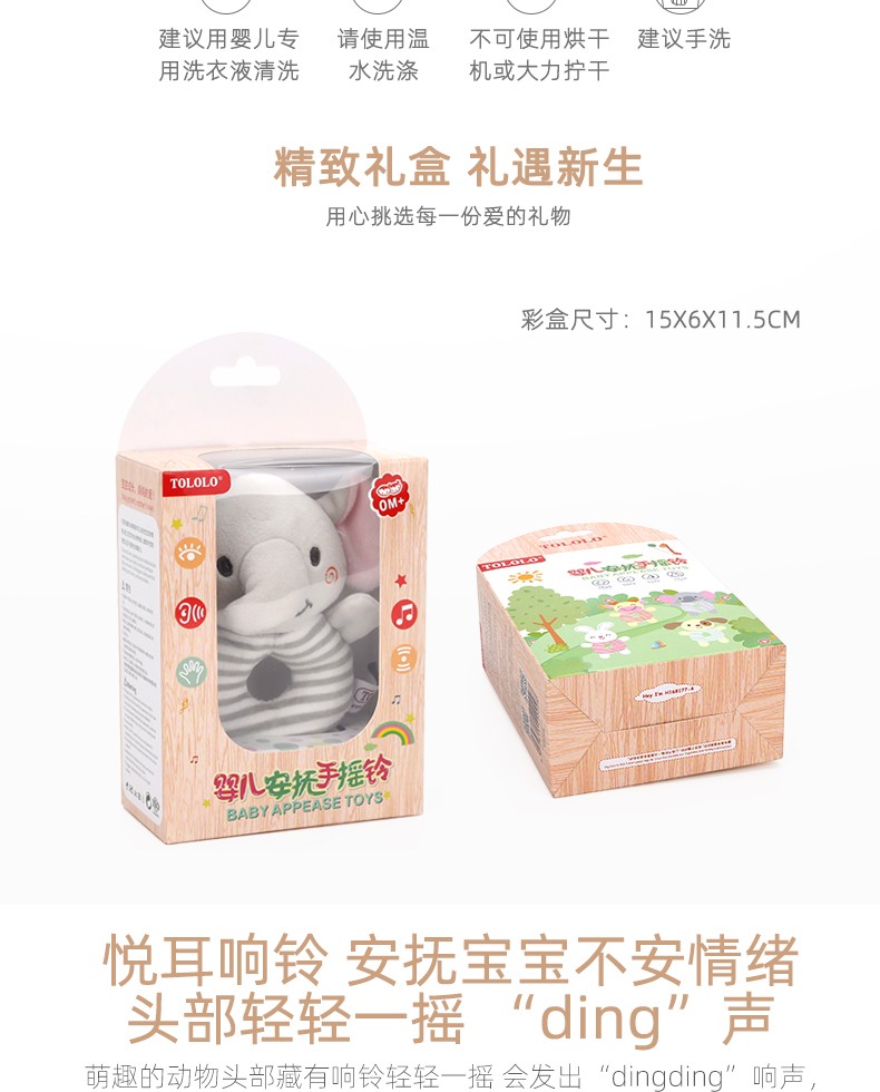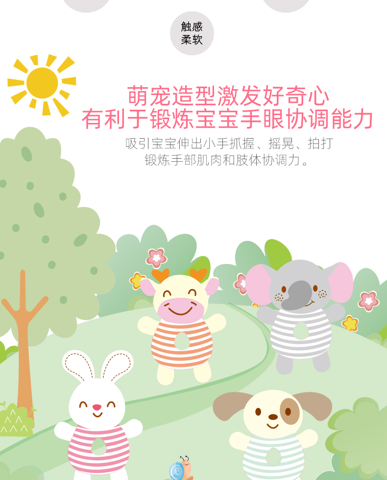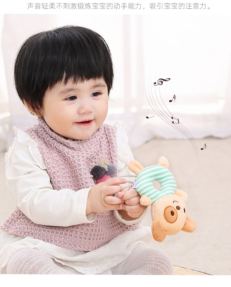 安撫手搖鈴,萌寵造型激發(fā)好奇心,有利于鍛煉寶寶手腳協(xié)調(diào)能力。吸引寶寶伸出小手抓握,搖晃、拍打,鍛煉手部肌肉和肢體協(xié)調(diào)力。悅耳響鈴,安撫寶寶的小情緒,頭部輕輕一搖“ding”聲,聲音輕柔不到刺激鍛煉寶寶的動手能力,吸引寶寶的注意力。