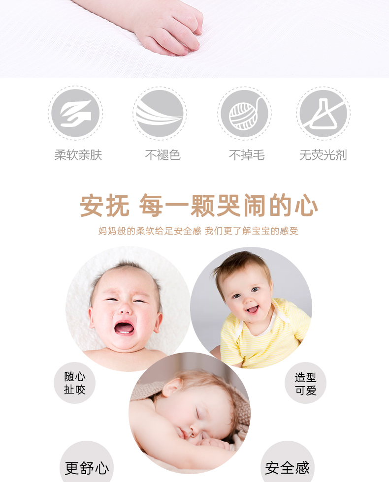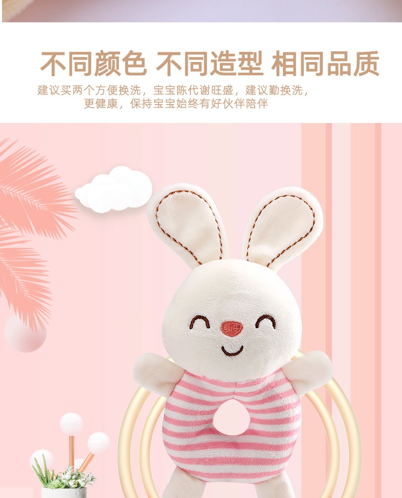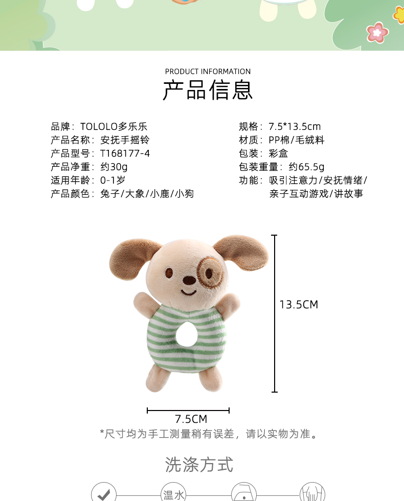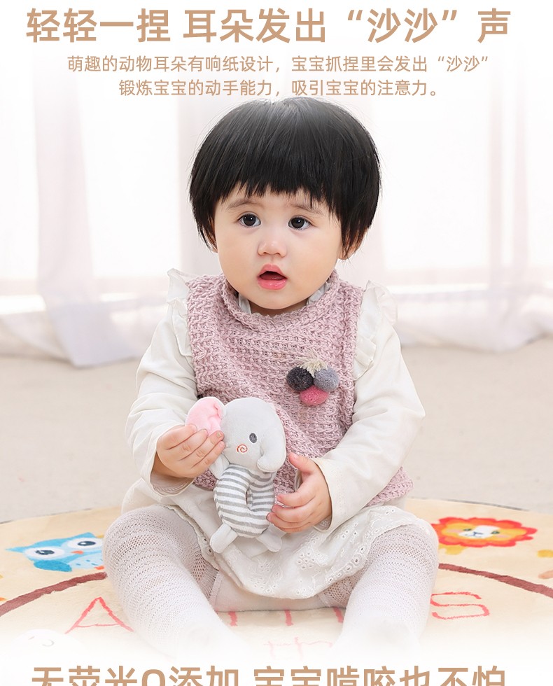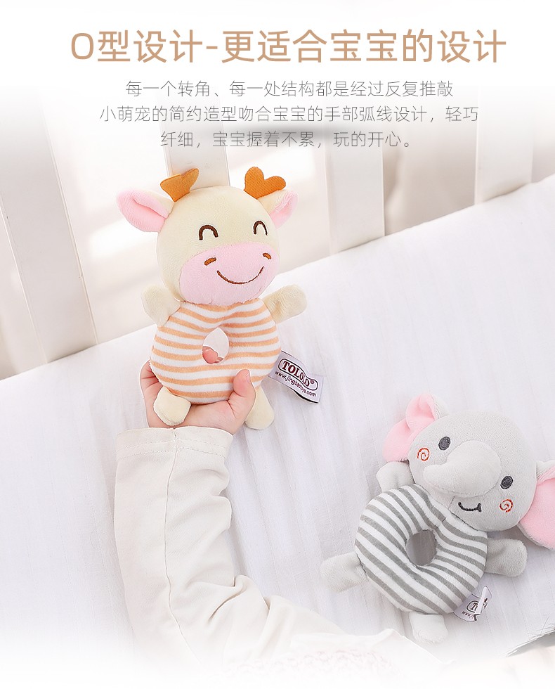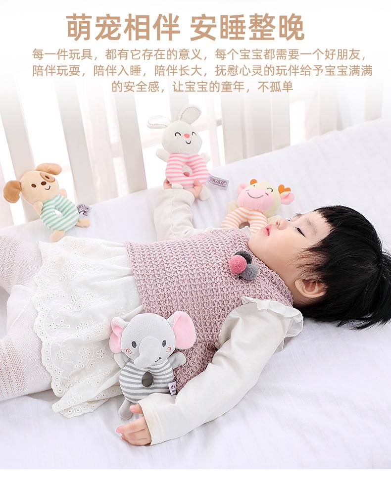安撫手搖鈴,萌寵造型激發(fā)好奇心,有利于鍛煉寶寶手腳協(xié)調(diào)能力。吸引寶寶伸出小手抓握,搖晃、拍打,鍛煉手部肌肉和肢體協(xié)調(diào)力。悅耳響鈴,安撫寶寶的小情緒,頭部輕輕一搖“ding”聲,聲音輕柔不到刺激鍛煉寶寶的動手能力,吸引寶寶的注意力。