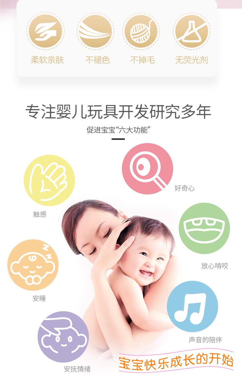 東莞市景寶嬰童玩具用品有限公司是一家集研發(fā)、設(shè)計(jì)、生產(chǎn)和營(yíng)銷為一體的嬰幼兒玩具及用品有限公司,擁有三百多項(xiàng)自主知識(shí)產(chǎn)權(quán)的版權(quán)和專利,是國(guó)內(nèi)為數(shù)不多的真正具有自主品牌的玩具企業(yè)。專注研發(fā)生產(chǎn):嬰幼兒毛絨玩具、早教玩具、床鈴?fù)婢摺u鈴?fù)婢摺⒉紩?shū)玩具、0-1歲寶寶玩具等。18年行業(yè)經(jīng)驗(yàn),支持各類嬰兒玩具定制批發(fā),玩具廠家咨詢熱線:0769-86175921
